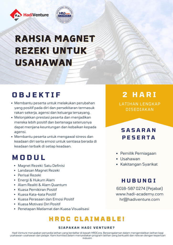 - Peserta memahami konsep Magnet Rezeki dan bagaimana ia diaplikasikan dalam kehidupan harian dan perniagaan.